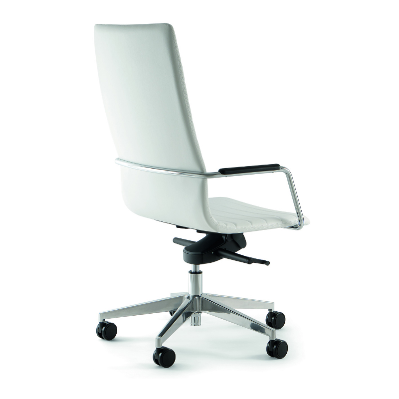 Minimalistisk og elegant kontorstol til kontoret eller mødelokalet. De horisontale dekorative syninger giver stolen et stilfuldt udseende. Faste armlæn Ø20 mm i krom, betrukket med sorte polyurethankuder. 5-stjernet fodkryds i poleret aluminium.