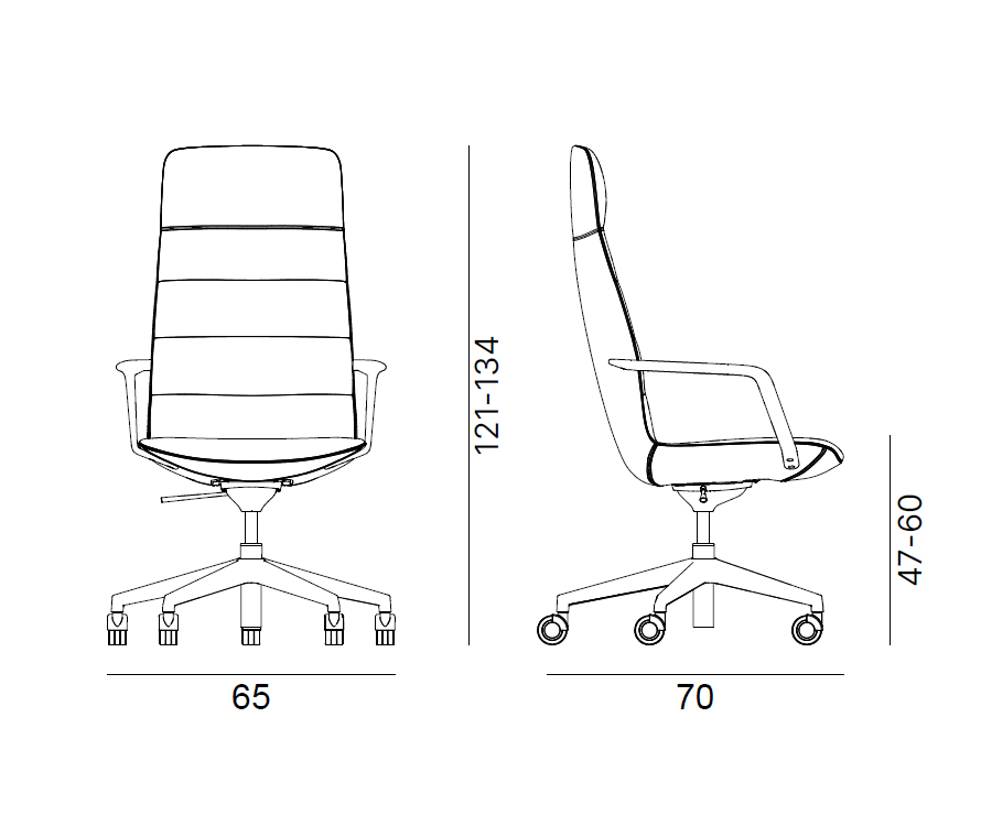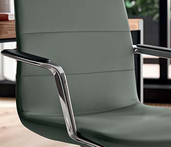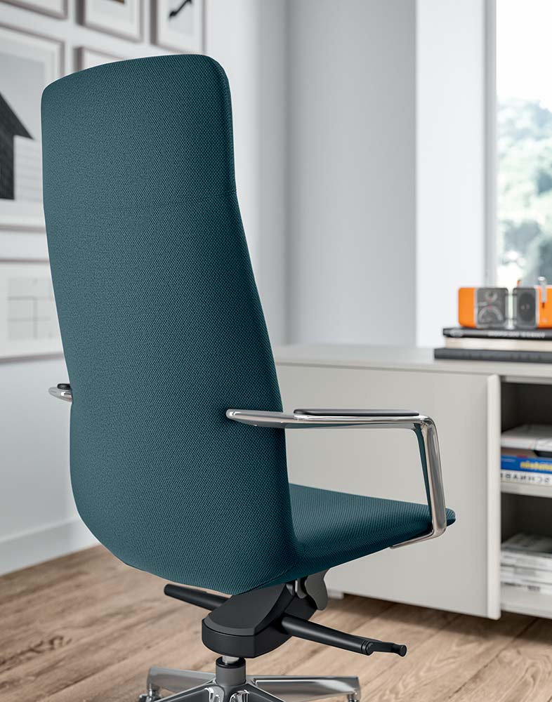 Som standard højdejusterbar og udstyret med enkel vippefunktion. Stolen kan nemt udstyres med låsbar vippefunktion i fire positioner samt indbygget antichock-system, hvilket giver høj komfort og optimal bevægelsesfrihed hele arbejdsdagen. Armlæn i sortlakeret eller poleret aluminium. Som tilvalg kan armlænene betrukket med elegant læder. 5-stjernet fodkryds i sort nylon eller poleret aluminium.