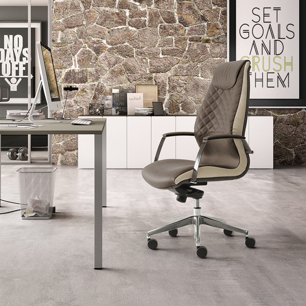 Den indvendige struktur består af bøgefiner, polstret med koldskum, som er sprøjtet ind og brandhæmmende. 5-stjernet fodkryds i poleret aluminium. Tiltmekanisme, låsbar i 6 forskellige positioner med antichock-system og justerbar vippe­modstand. Faste armlæn i krom og polstret med eksklusivt læder. Sæde og ryg er beklædt med ægte italiensk kvalitetslæder. Den quiltede ryg med kontrasterende tråd giver stolen et dynamisk og unikt udtryk.