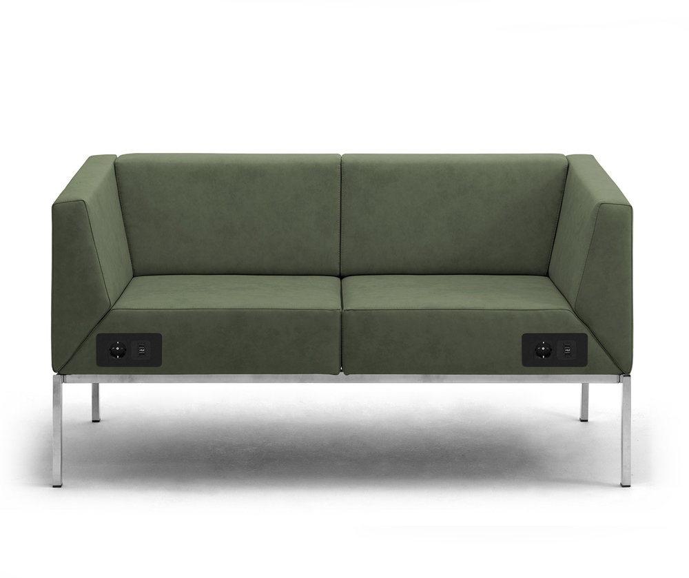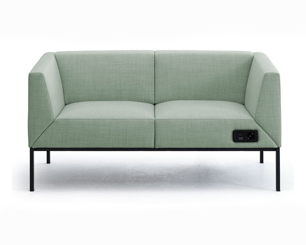 Fremstillet i træ og krydsfinér med en minimalistisk stålramme, der giver både stabilitet og et moderne, stilrent udtryk. Rammen fås i sort lak eller forkromet finish. Polstringen består af formfast, brandhæmmende koldskum uden CFC, hvilket sikrer lang levetid og tryg brug i offentlige rum. Betrækket findes i flere tekstiler og farver. Vælg mellem: stof Time, slidstærkt kunstlæder eller ægte italiensk læder. Som tilvalg findes fabriksmonteret el-udtag, perfekt til mobile enheder som bærbare computere eller mobiltelefoner.
