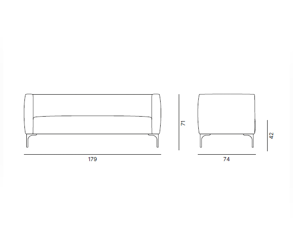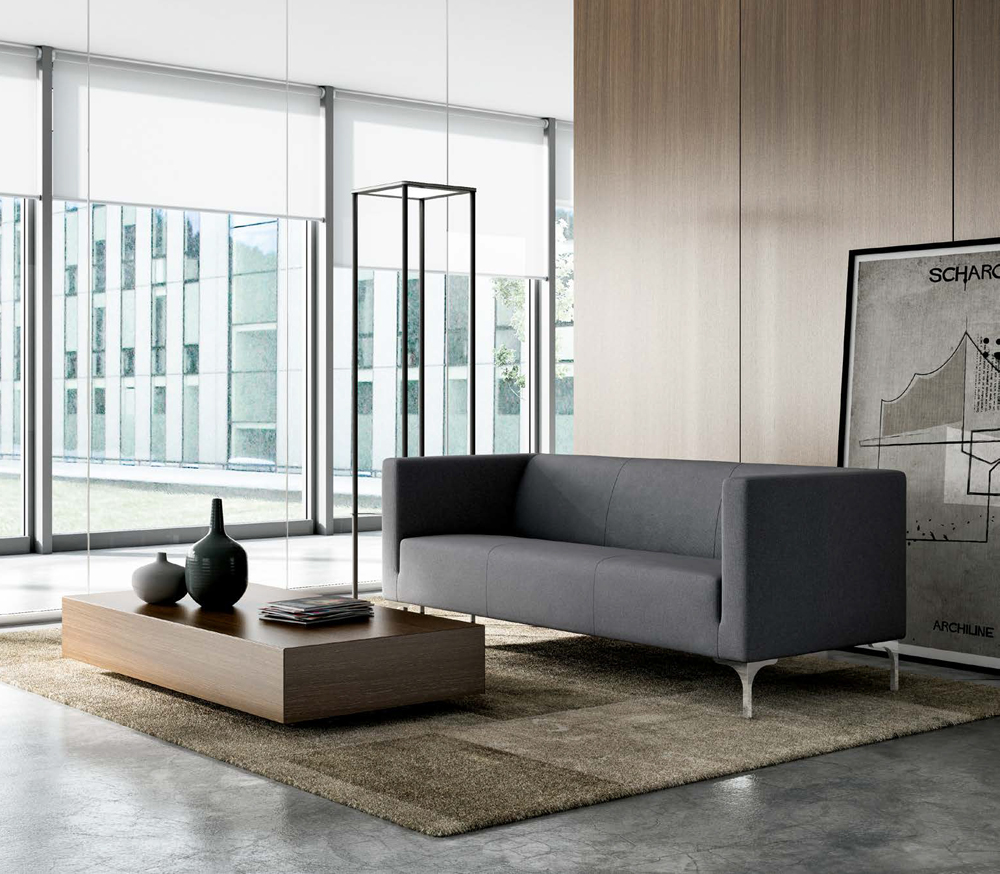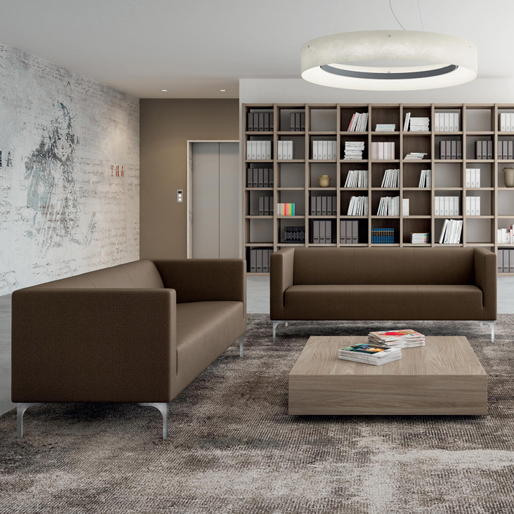 Vælg mellem stof Mirage, Step Melange eller Fenice (75% uld/25% polyester). Fås også i kunstlæder samt ægte læder. Alle materialer er tilpasset offentlige miljøer. Ben i poleret aluminium, hvilket giver sofaen en moderne og stilren finish.