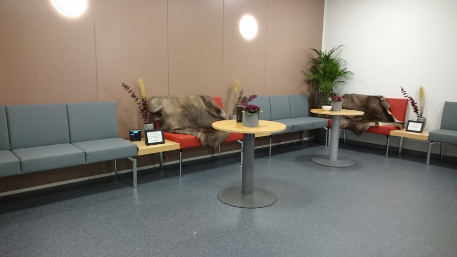 f.eks. receptioner, entréer, venteværelser, institutioner, kontorer osv.